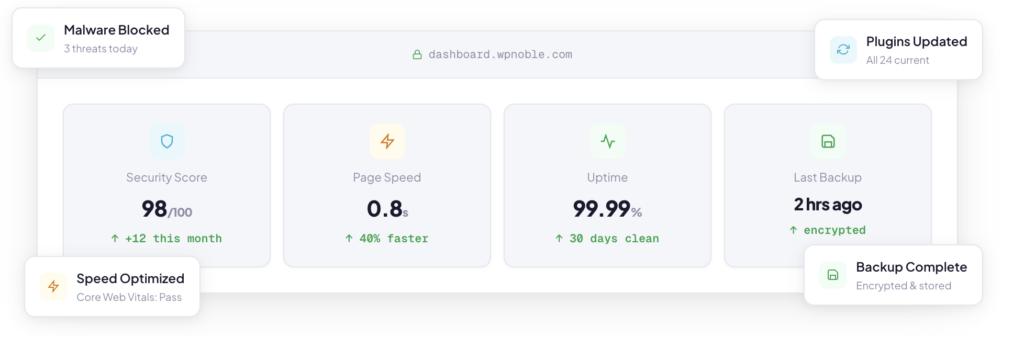 “We had constant plugin conflicts and downtime. Since WP Noble took over, our site hasn’t gone down once in 8 months. The peace of mind alone is worth it.”